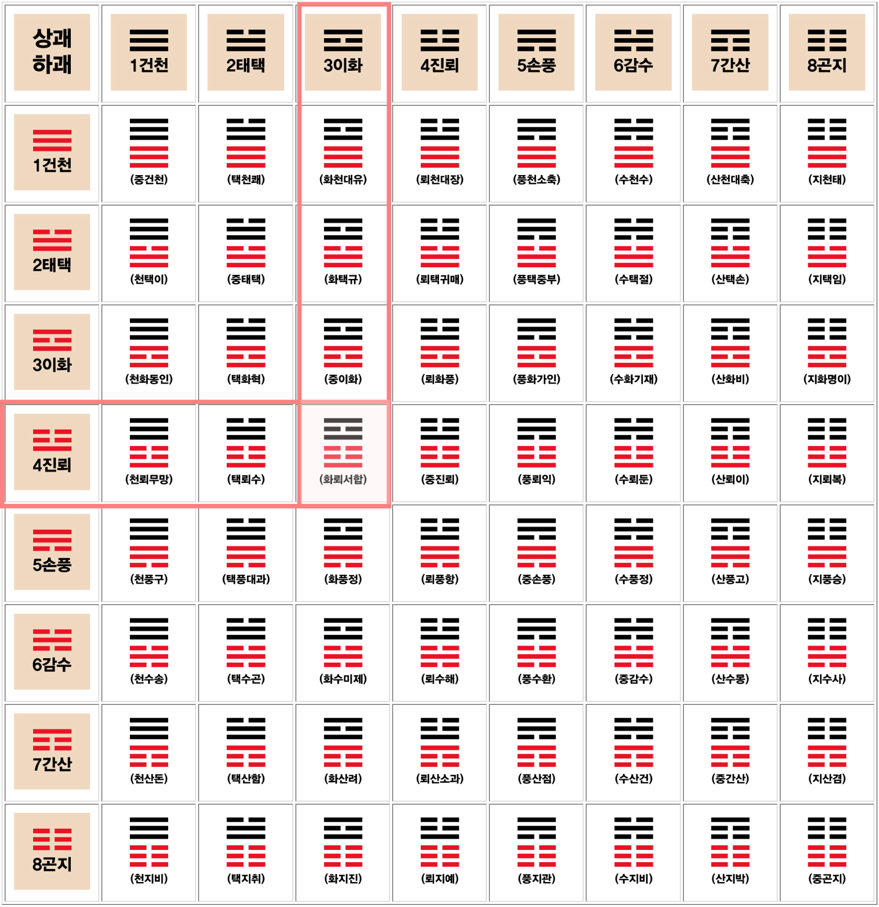 - 아래 3개의 효와 위에 3개 효를 이용해서 표를 보고 찾습니다.
